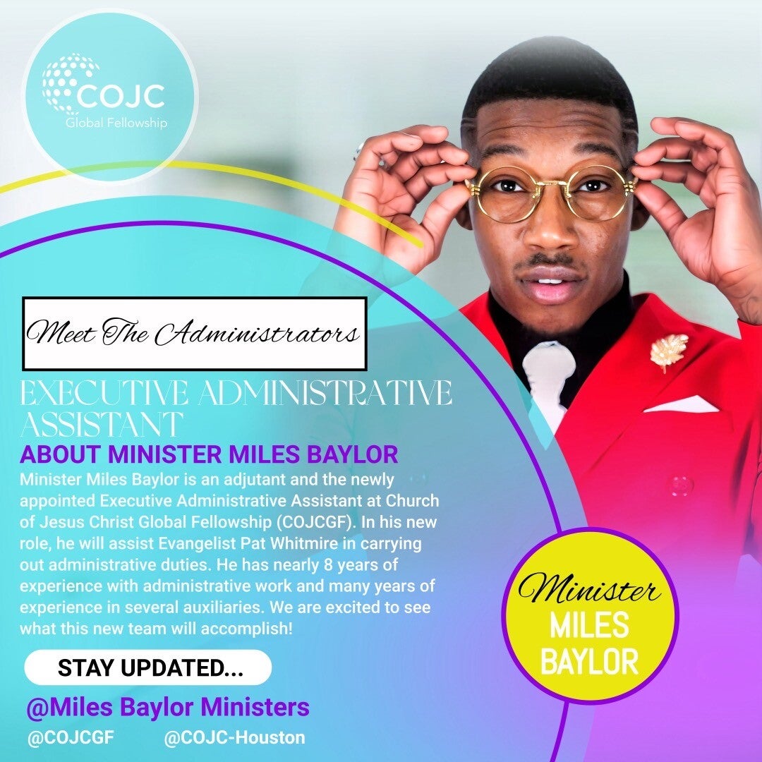 Miles Baylor was Born in Wharton Tx , Graduated from El Campo High School where he served at his Home Church For 22 years on the Usher Board, as a Choir Director , & with his own MIME Ministry. He moved to Houston Tx & Joined Greater Grace Houston and Served as a Usher , Teaching the dance ministry,& Now Serves as a Adjutant for his Apostle & First Lady. Miles Baylor is 32 years old and He has birthed out multiple Prophetic Worship Experiences for his Community under his own Ministry Called " Miles Baylor Ministries " God Has Called Him To Bring Different Ministries together to Worship God & To Help People get healed, delivered , & set free. Miles Baylor is also the Adjutant General for Kingdom Diminion Fellowship & Also Servers As A Adjutant & Executive Administrative Assistant for the Church Of Jesus Christ Fellowship & One of the Leaders of the UNITY DANCE Ministry , Certified Christian Counselor , Certified Chaplain, Is A Ordained Elder in the Lords Church . He is a true example of a servants heart & love he has for Gods people to Help Build The Kingdom.